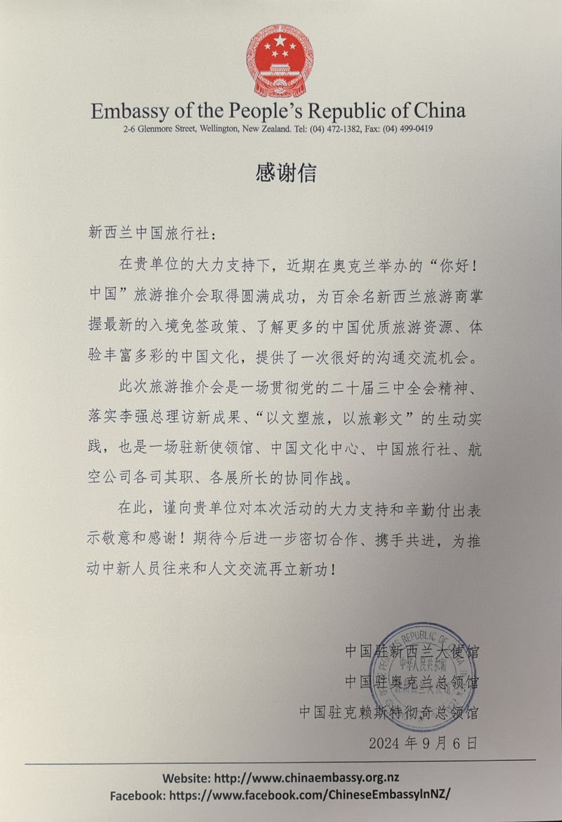 近日,中旅旅行所屬新西蘭中旅收到中國駐新西蘭大使館、中國駐奧克蘭總領(lǐng)館、中國駐克萊斯特長期總領(lǐng)館聯(lián)名感謝信。中國駐新西蘭大使館等單位對(duì)新西蘭中旅在奧克蘭舉辦的“你好!中國”旅游推介會(huì)中提供的支持表示感謝,并期待今后與新西蘭中旅進(jìn)一步密切合作,為推動(dòng)中新人文交流和人員往來再立新功。